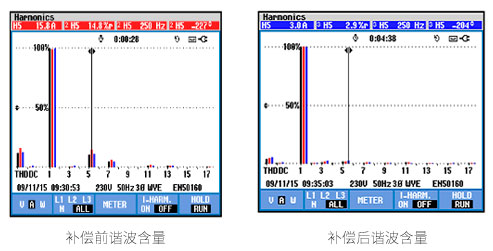 補償前5次諧波電流15.8A畸變率14.8% ,補償后5次諧波電流3A畸變率2.9%)